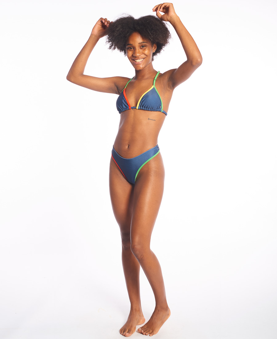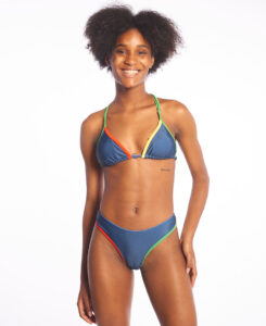Bikini Y Tu Quique? Denim Jam.TRICOT 85% POLIESTER 15% ELASTANO. Breteles a contratono con regulador. Sublimado forrado. Taza soft desmontable. Protector higiénico. Collaretas combinadas. Wtiqueta plastisol. Triángulo móvil.
