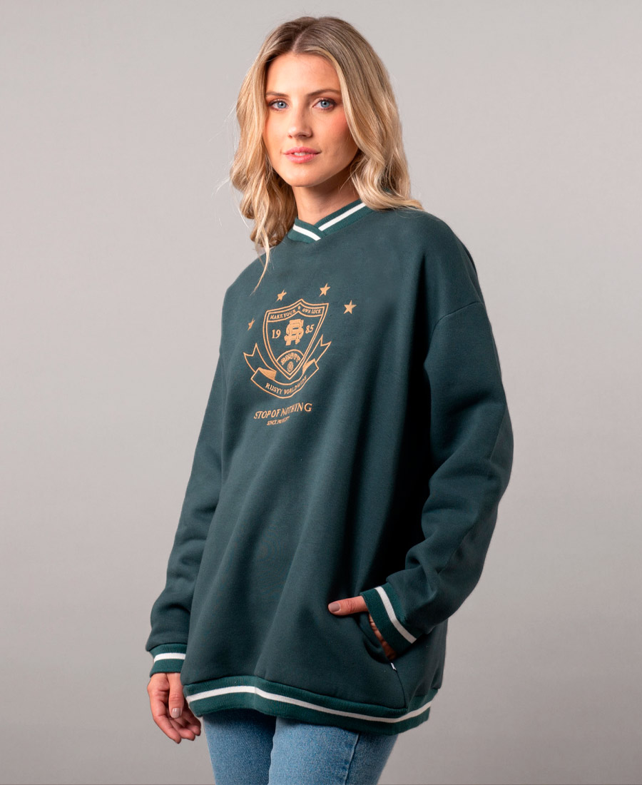 Buzo Rusty South Over de cuello en V holgado con bordado frontal. 58 % poliéster / 42 % algodón. Corte holgado oversize. Bolsillos laterales.