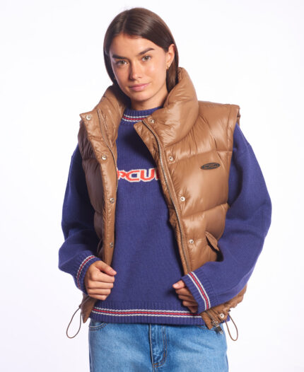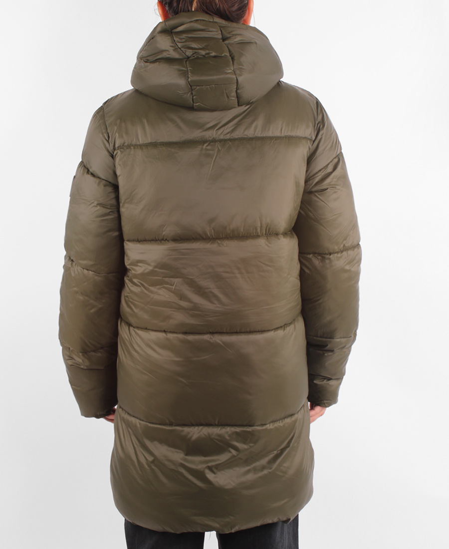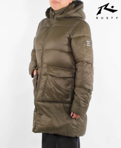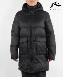 Campera Rusty Puffer Long Essentials. 100 % Poliester. Cuello alto con capucha. Bolsillos amplios en su frente. Detalles de logo en la manga.