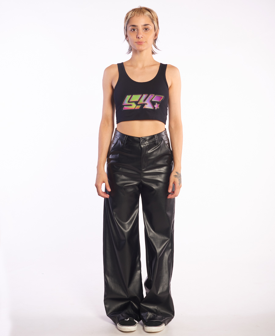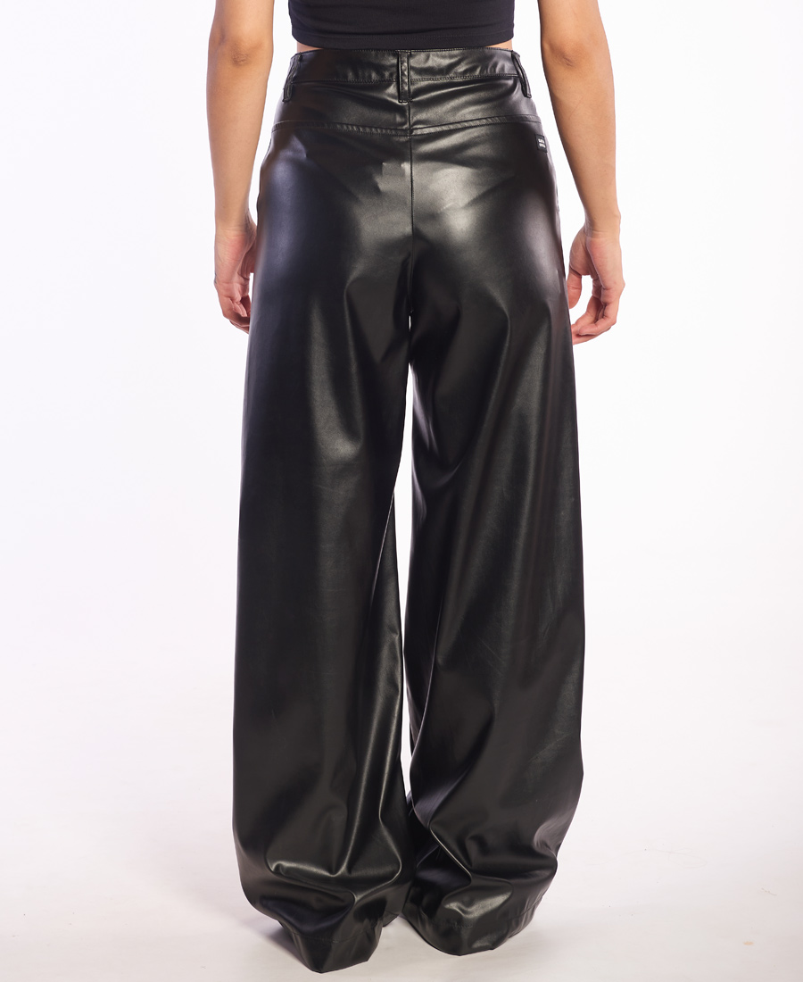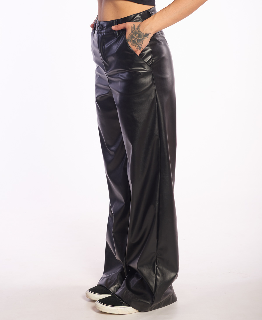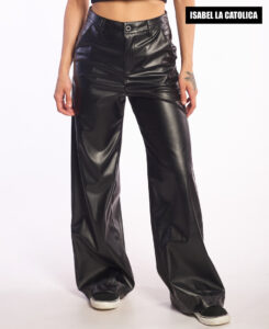 Pantalón recto de cuerina lisa straight bolsillos laterales. Avíos marcarios.